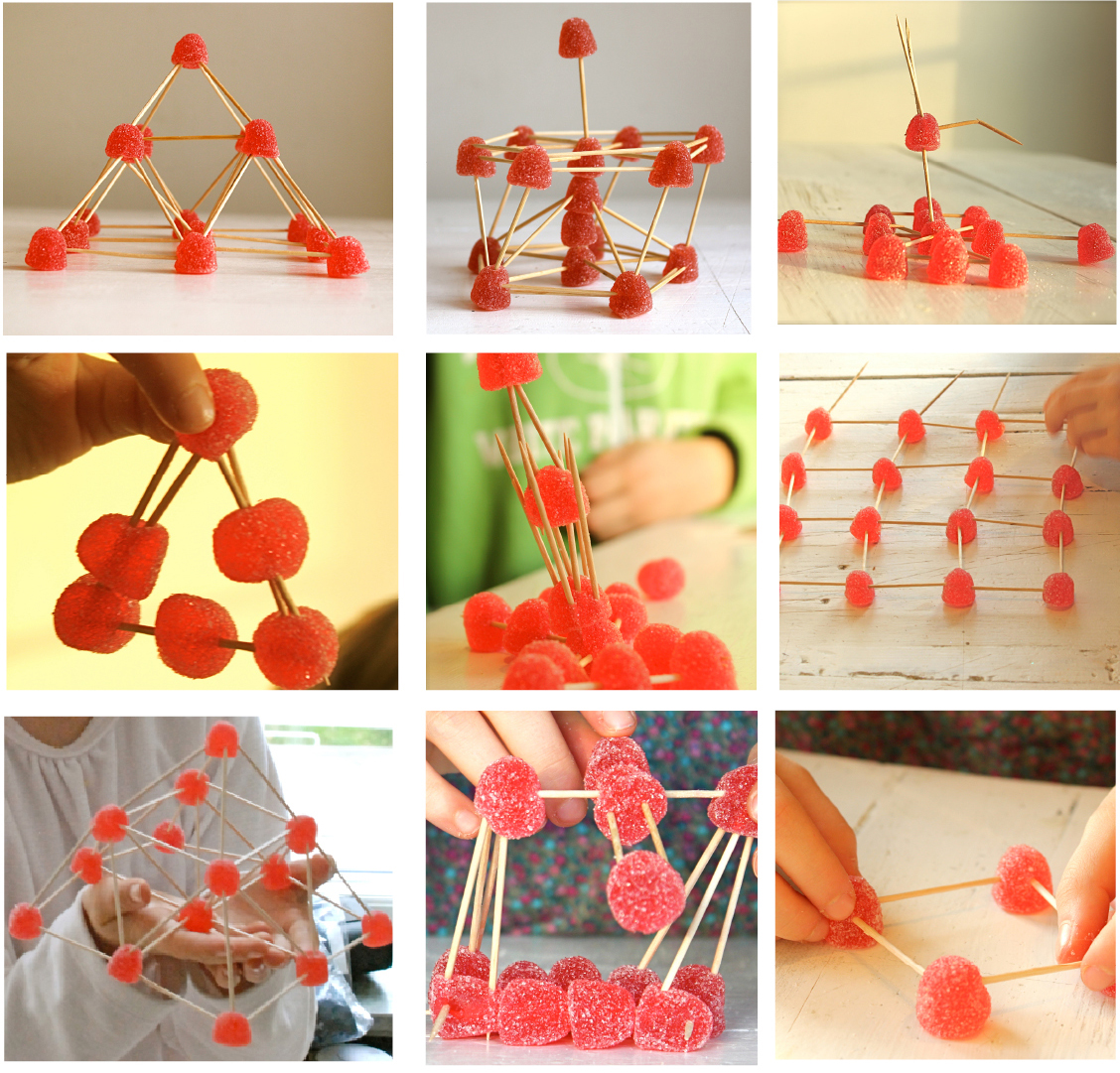 Gumdrop pyramid: Have you ever built a gumdrop pyramid, like one shown on the second row and on the bottom, left corner? My daughter picked this up from an ultra, creative, and talented, friend, FJ, who had visited the Stockholm Architect Museum and had seen it there! I was so happy when our daughter came home from their house with this cool creation! I ‘ll share a how-to for this, in a post later. If you already know this pyramid technique, then, once the kids have finished their “14 GUMDROP PROJECT,” get out more gumdrops and see how high they can build a gumdrop pyramid. Aren’t they beautiful?